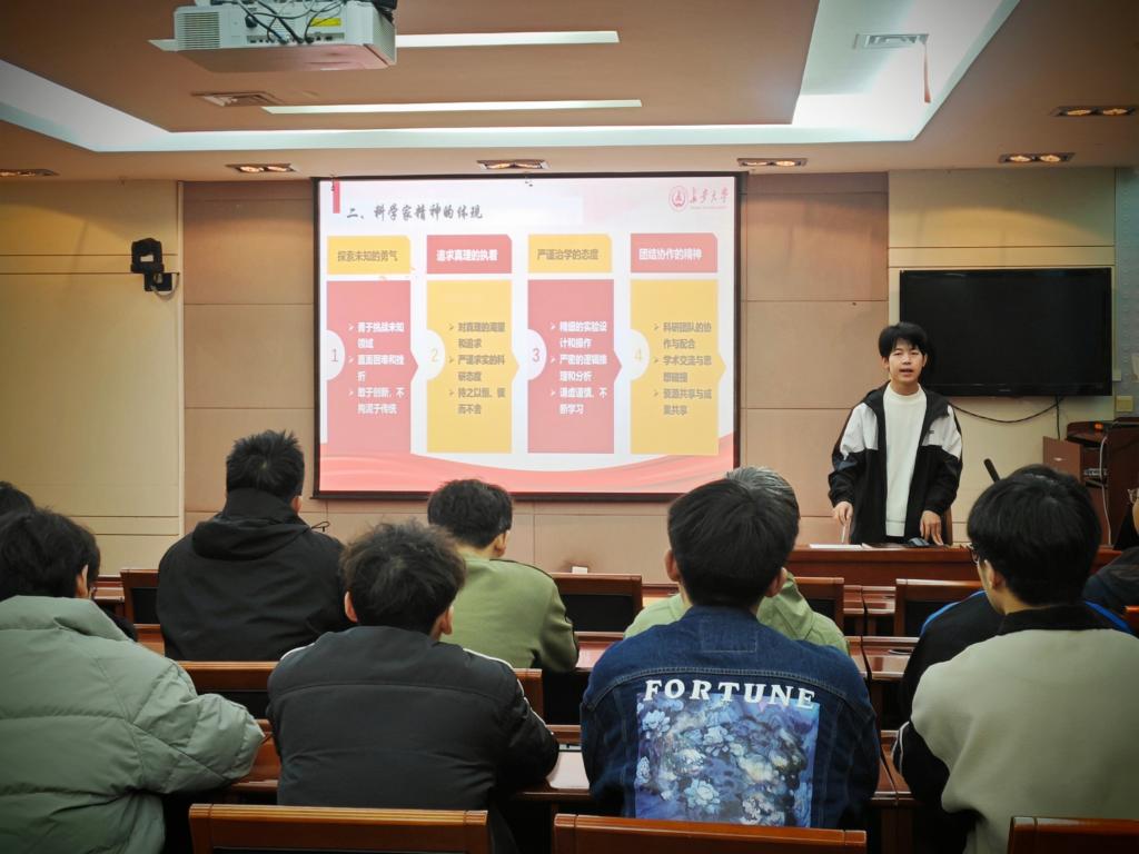 为深入学习贯彻习近平新时代中国特色社会主义思想和党的二十届三中全会精神,大力弘扬科学家精神,涵养优良学风。必赢76net线路唯一官方网站2024级研究生第一党支部于11月15日下午在南校区北院交流中心第一会议室开展“弘扬科学家精神,争做新时代追梦人”主题党日活动。研究生辅导员王佩佩及全体党员参加活动,活动由党支部书记张兴浩主持。
