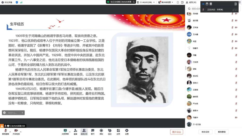 本次分享会以杨靖宇的英雄事迹为素材,为支部成员上了一堂生动的思政课。通过对革命先辈精神的传承与发扬,大家进一步加深了对革命历史的理解,激励大家在新时代继续努力拼搏,为实现中华民族的伟大复兴贡献力量。