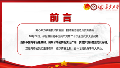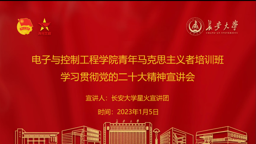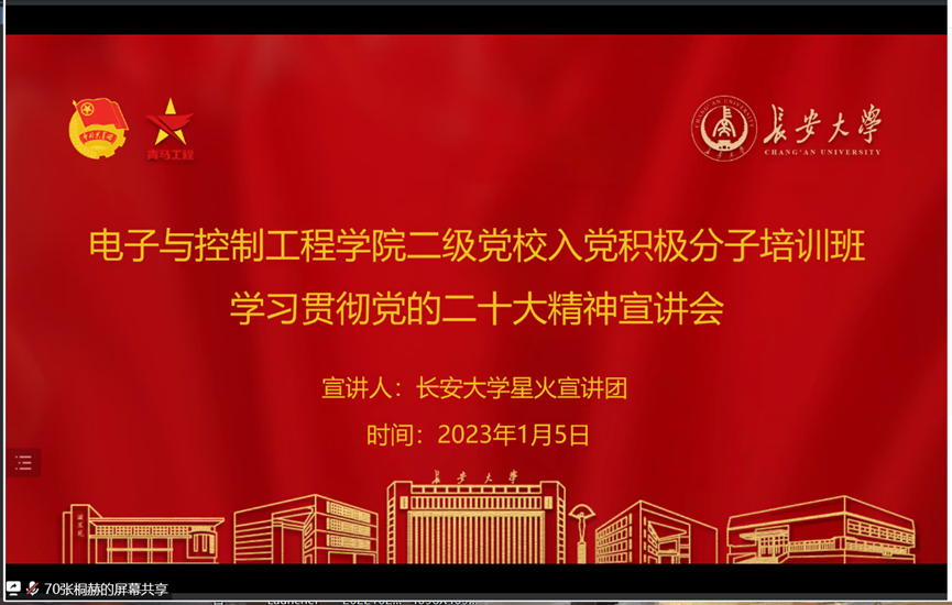 为深入学习贯彻党的二十大精神,增强广大学生爱党爱国信念,2023年1月5日上午10时,必赢76net线路唯一官方网站以腾讯会议的形式举行二级党校入党积极分子培训班暨第十五期青年马克思主义者培训班学习贯彻党的二十大精神宣讲会。必赢76net线路唯一官方网站党委副书记李阳、学工办主任高婷、团委书记王斌娟,团委副书记王博、许必颖、高朋举,辅导员张馨月出席会议,长安星火宣讲团、必赢官网各学生党支部党员、入党积极分子子、第十五期青马班全体学员参加本次会议,会议由青马班学员张桐赫主持。