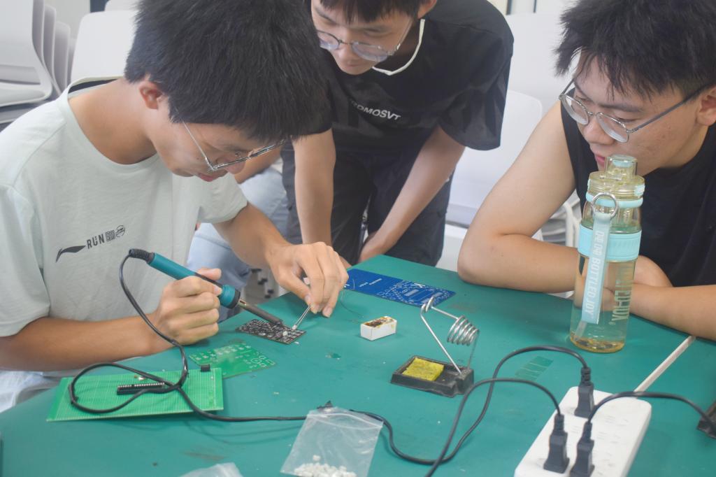 电控科协电子竞赛部布设了电焊用品和优秀作品展示区,并提供了试焊环节。部门成员在现场协助讲解指导,介绍了电焊工具的使用方法和安全要点。许多新生在成员的帮助下尝试了电焊操作,获得了新奇的体验。