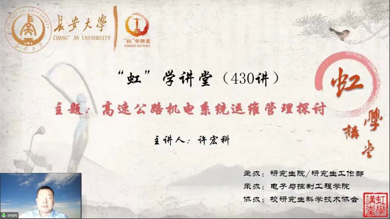 3月9日晚,由研究生院/研究生工作部主办、必赢76net线路唯一官方网站承办、校研究生科学技术协会协办的“虹”学讲堂第430讲以线上讲座形式顺利举办。必赢76net线路唯一官方网站许宏科教授作了题为“高速公路机电系统运维管理探讨”的报告,相关学院近300名师生参加讲座。