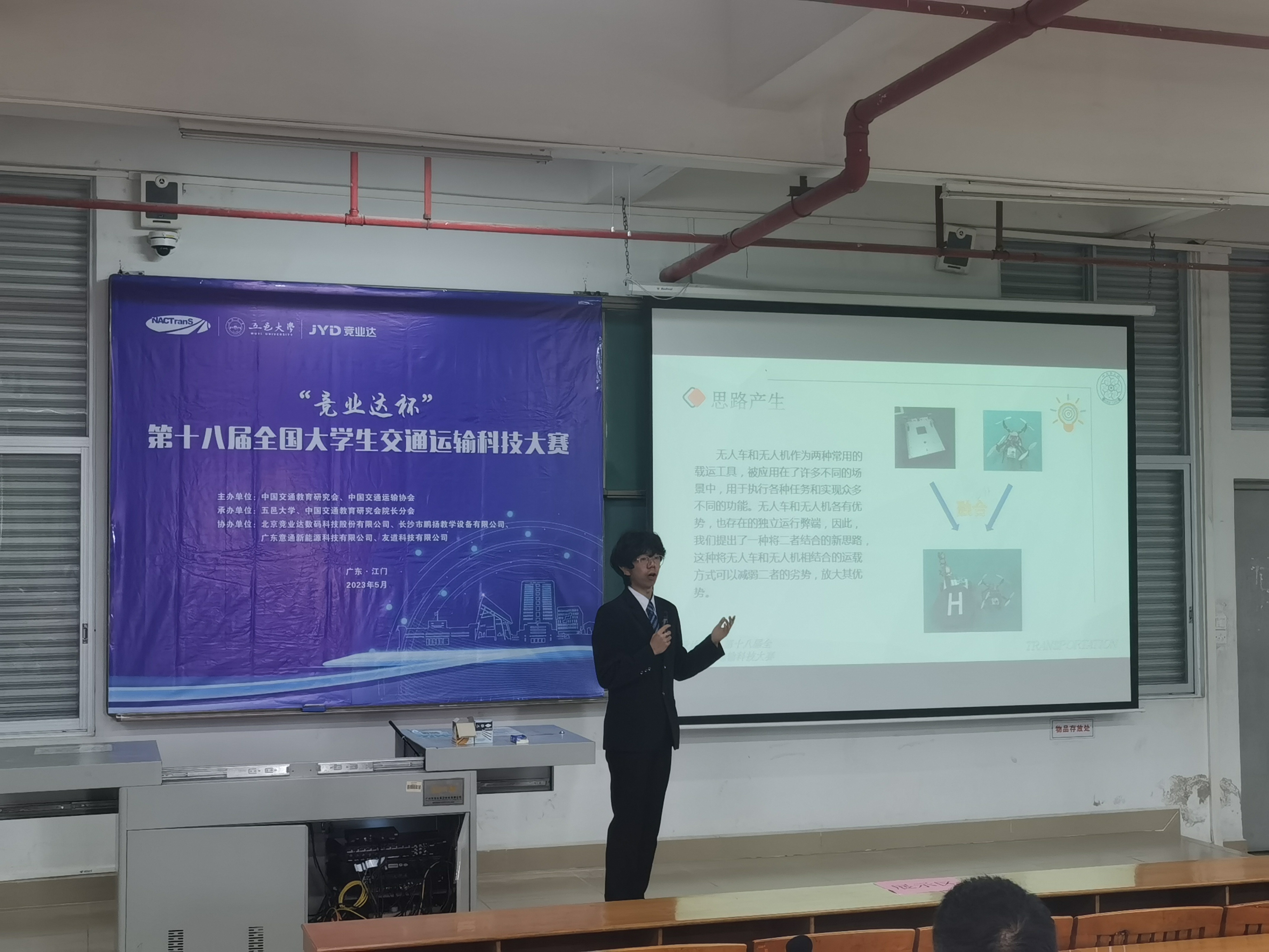 5月28日,第十八届全国大学生交通运输科技大赛总决赛在广东江门落下帷幕。本次大赛共吸引了全国1000余支高校队伍参赛,经过层层选拔共235件作品入围全国总决赛。必赢76net线路唯一官方网站黄鹤教授指导的研究生谢飞宇、胡凯益、温夏露、李东强、马浩然组队参赛,经过五个月的精心筹备,参赛作品《陆空协同车-机载运融合系统》在“第一届陕西省大学生交通科技大赛”中获得省级一等奖,并入围总决赛。经过实验测试、线上选拔、现场答辩等环节,必赢官网团队最终获得全国二等奖。