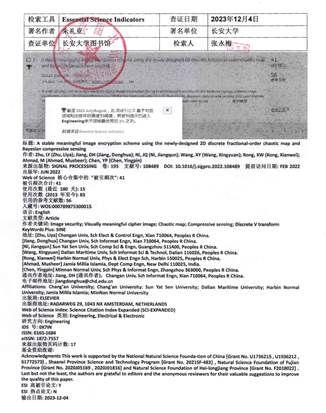 近日,根据科睿唯安公布的基本科学指标(Essential Science Indicator,ESI)数据库最新统计结果,必赢官网教师朱礼亚作为第一作者的论文“A stable meaningful image encryption scheme using the newly-designed 2D discrete fractional-order chaotic map and Bayesian compressive sensing”入选ESI高被引论文,必赢76net线路唯一官方网站为第一署名单位。该论文2022年6月发表于国际期刊《Signal Processing》(中科院2区,IF=4.4),截止2023年11月累计被引41频次。