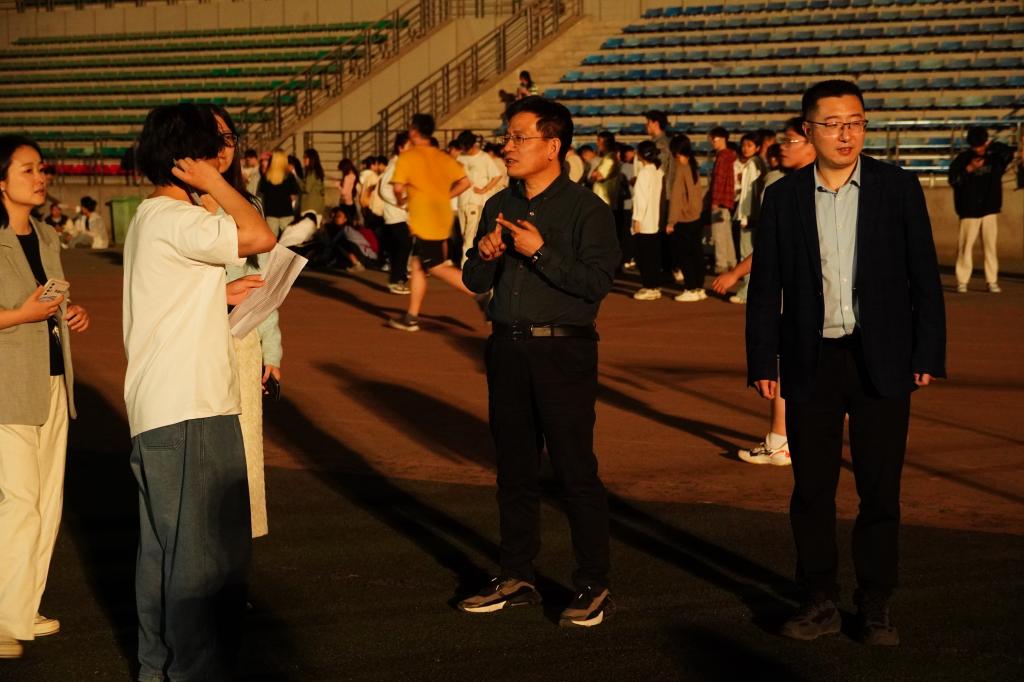 4月11日晚,必赢76net线路唯一官方网站党委书记贺炳彦、院长闫茂德、党委副书记李阳及全体辅导员来到北校区朝晖体育场慰问学院2024年春季运动会备赛运动员并指导训练。