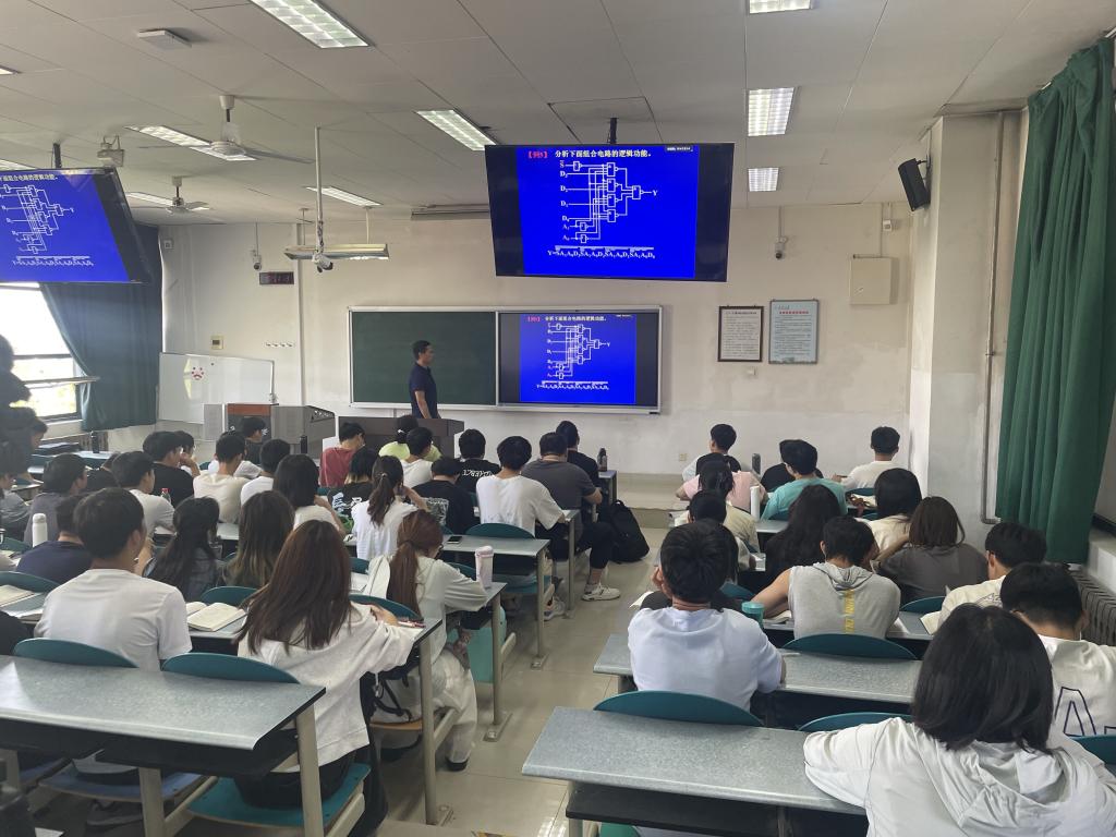 此次教学观摩的课堂是杨照辉老师的电工与电子技术基础Ⅲ(二),上课教室为渭水校区WM1410,采用的是随堂的形式进行观摩。基础教学部的刘岳镭老师、易盟老师、交控系的牛鸿敏老师、王学楷老师、自动化系的刘习尧老师、机器人工程系的梁浩翔老师、郭一鸣老师、轨道卓工系的刘维宇老师、王彬宇老师参加了此次课堂教学观摩。杨照辉老师表示本次课程的主要内容是:数字电子技术中组合逻辑电路分析,三人表决器等。课杨照辉老师与观摩教师做了讲课内容的交流,分享了多年来积累的讲课经验。