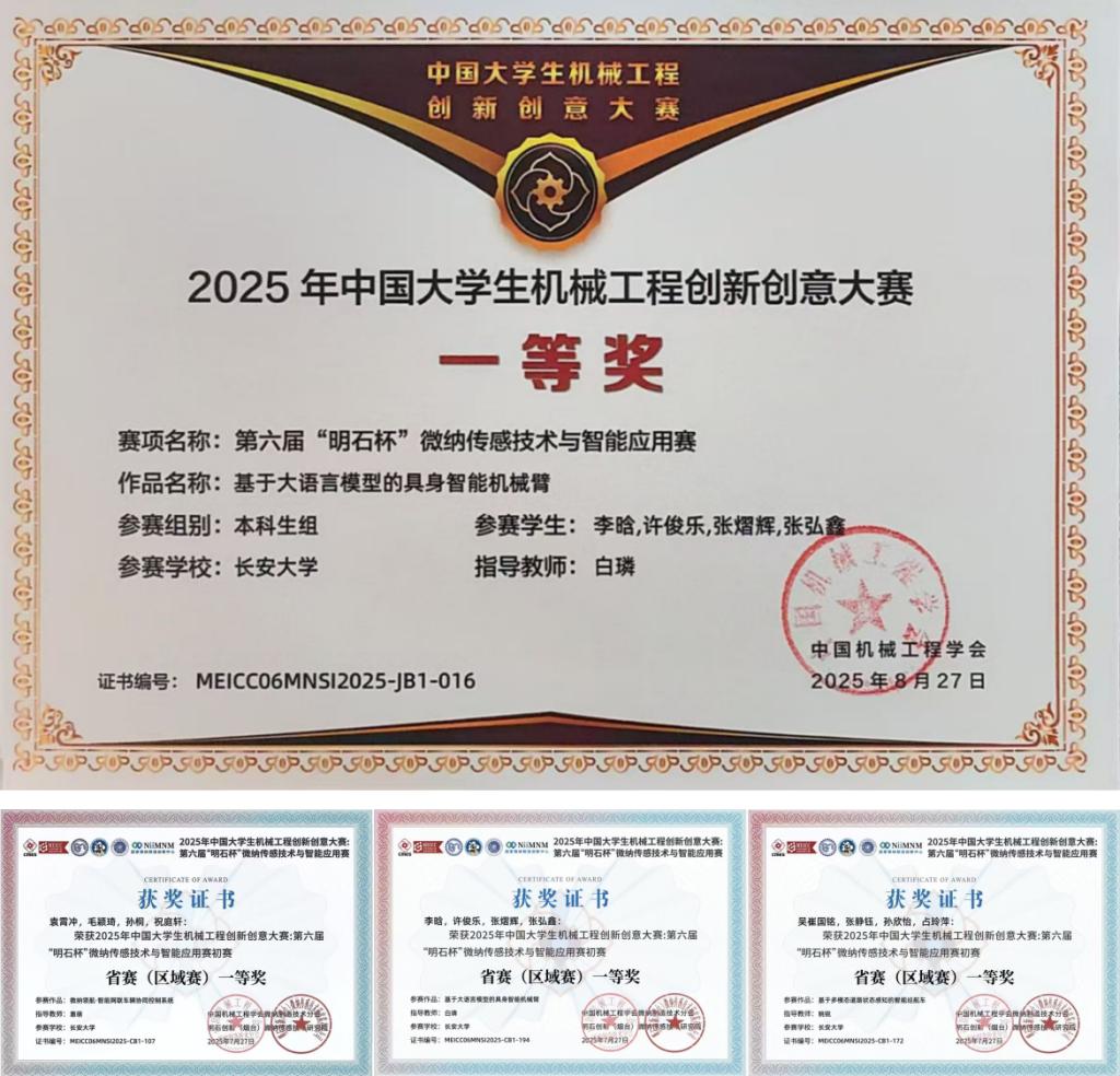必赢76net线路唯一官方网站白璘副教授指导的李晗、许俊乐、张熠辉、张弘鑫团队以“基于大模型的具身智能机械臂”为主题开发了一款集成了大语言模型的智能机械臂。作品围绕人工智能技术发展现状调研、关键技术攻关和硬件系统搭建,形成了完整的实施路径,并提出了大语言模型前端部署等关键问题的解决方案。凭借突出的技术创新与工程实现能力,团队赢得了专家评委的一致高度评价,最终斩获全国一等奖。必赢官网惠萌教授指导的袁霄冲团队和姚锐老师指导的吴崔国铭团队分获陕西省一等奖。